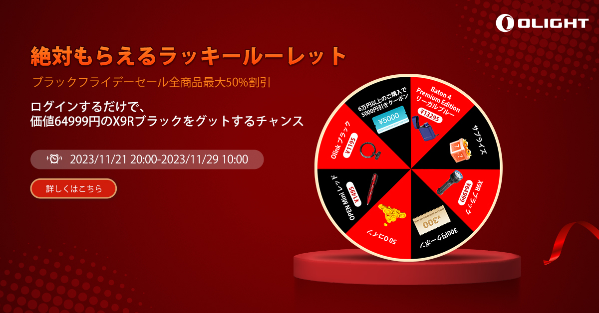 ブラックフライデーセールを企画するにあたり、OLIGHTの商品をより安く購入して頂く方法を考えました。 今回のイベント割引は、サイト全体(OClipを除く)の全商品を対象としており、割引率は15%~50%OFFとなっております。各種クーポンや無料プレゼント特典と合わせて、最高品質のOLIGHT商品をより低価格で購入することができます!