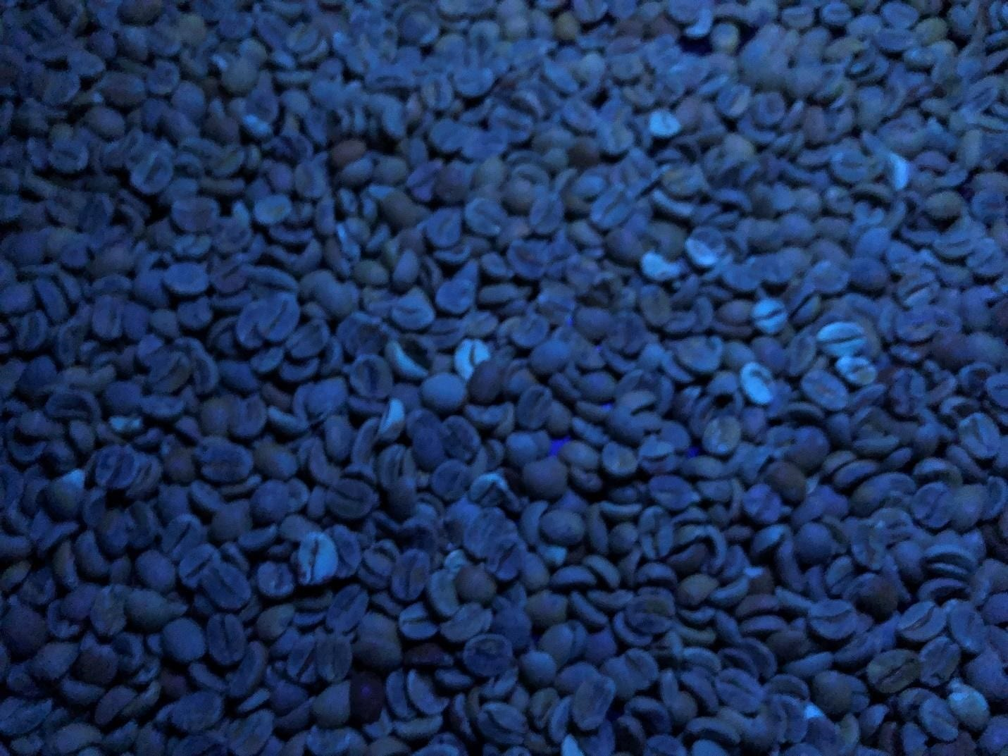 傷んだコーヒー豆は、紫外線の吸収が異なるため、照射下で目立ちます。