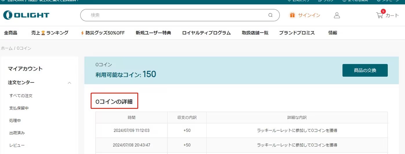 A:「マイアカウント」で「Oコイン」をクリックするとOコインの詳細が表示されます。
