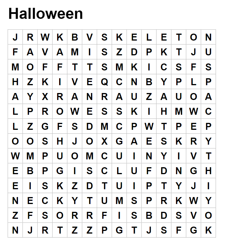 📕ルール:下の絵の中に12個の英単語が隠れています。英単語は、水平、垂直、斜めに配置されて、順方向(左から右、上から下)に並んでいます。ハロウィンに関係する単語を6つ見つけてください。