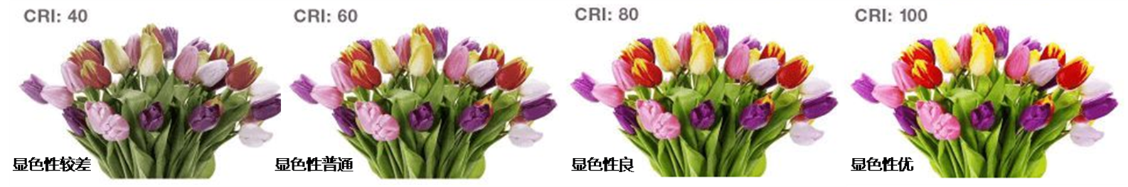 ▲上の写真は、色温度は同じだが演色評価数の異なる光源の下での同じ鉢植えの花の色を示しています。演色評価数が良い(つまり演色評価数が高い)ほど、花の色が実物の色に近いことが直感的にわかります。▲