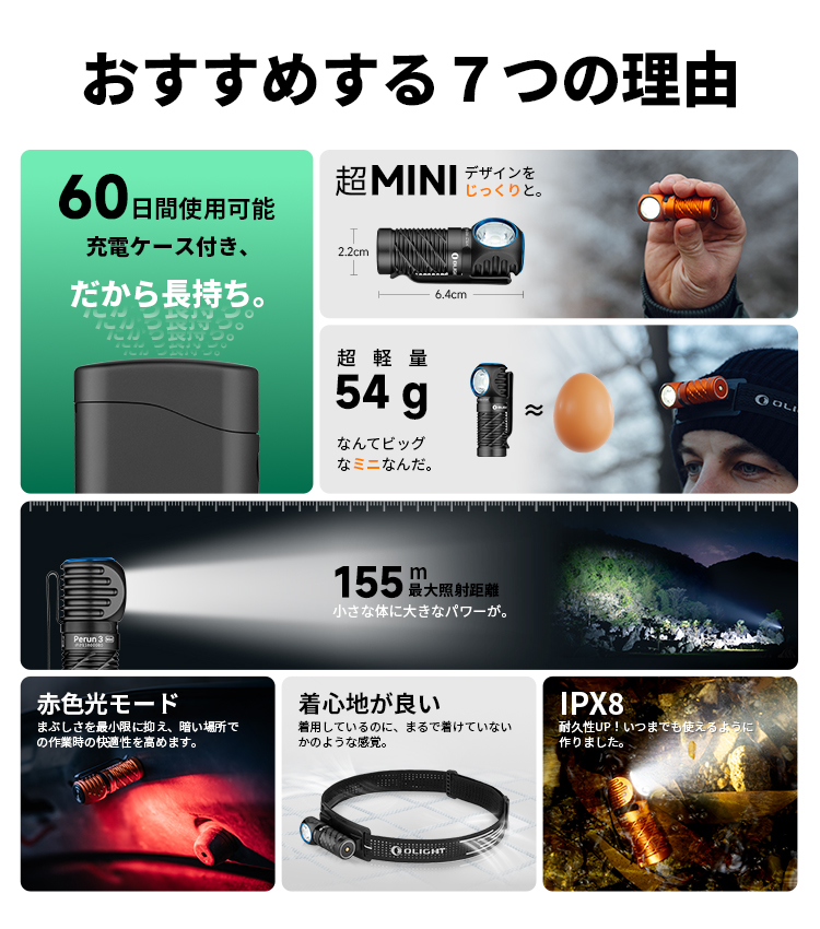 HCRIバージョンでも、Perun 3 Miniの特徴である「磁気ベース」「防水機能(IP68)」「軽量設計」はそのまま。ヘッドランプとしても、EDCライトとしても活用できます。