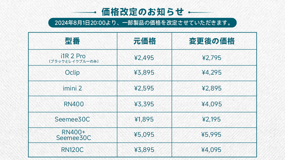 i1R 2 Pro(プラックとレイクプルーのみ)、Oclip、imini 2、RN400、Seemee30C、RN400+Seemee30C、RN120C(※価格詳細は画像をご覧ください)