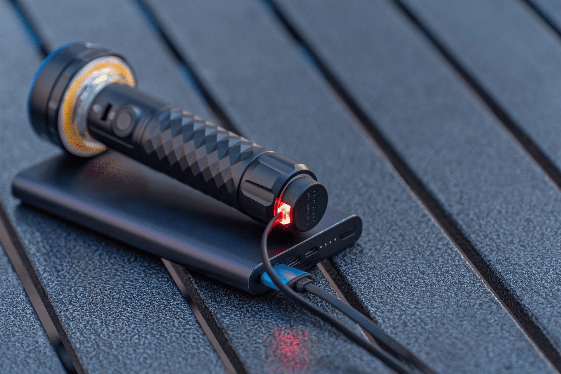 Prowess には2つの充電方法があり、磁気 USB-C 充電ベースまたは OlightのMCC 充電ケーブルを使用できます。