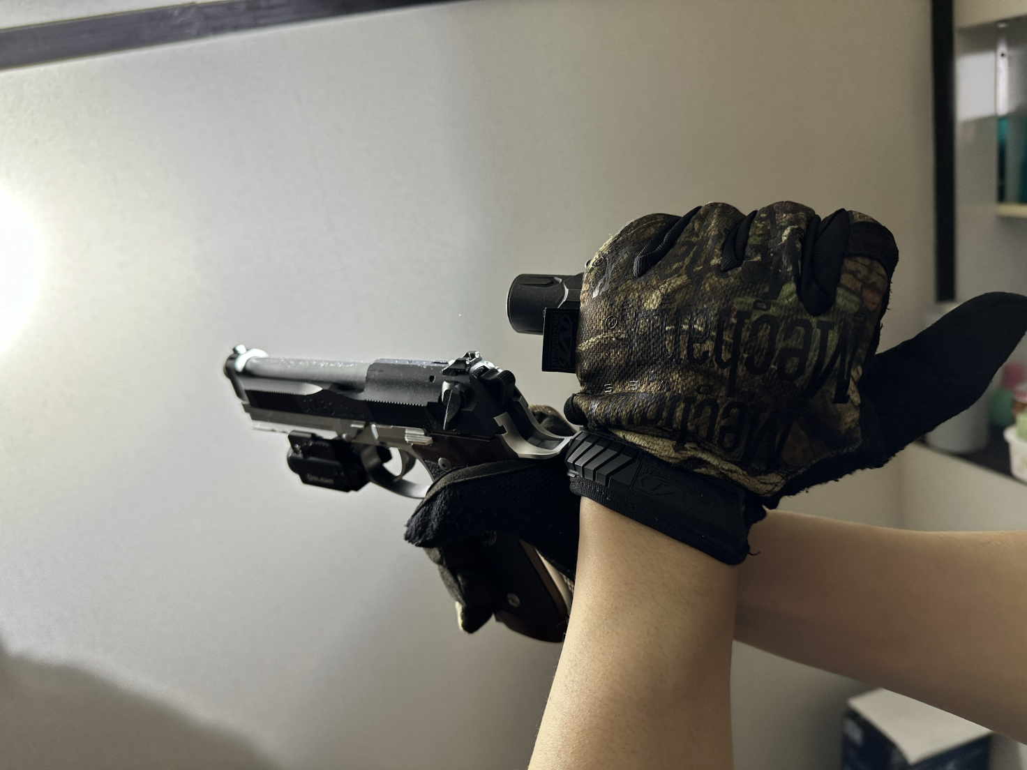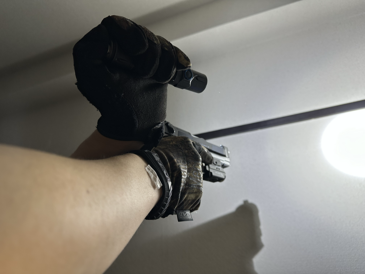 さて、使用感ということになるのですが最初はハンドガンと共に構えた際の写真を載せておこうと思います。warrior3sのその名の通り、形や性能がとても優れておりまさしく戦士が持つにふさわしいライトです。